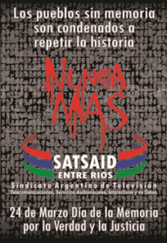 Ante un nuevo aniversario del brutal golpe de estado de 1976, este 24 de marzo: día Nacional de la Memoria por la verdad y la Justicia,la comisión Ejecutiva del SATSAID Entre Rios quiere recordar y homenajear a los caídos y desaparecidos en la lucha por la construcción de una Argentina mejor y para todos.