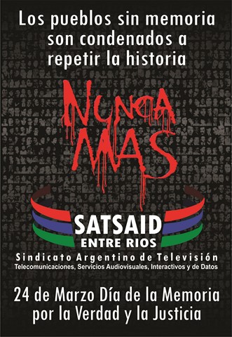 Ante un nuevo aniversario del brutal golpe de estado de 1976, este 24 de marzo: día Nacional de la Memoria por la verdad y la Justicia,la comisión Ejecutiva del SATSAID Entre Rios quiere recordar y homenajear a los caídos y desaparecidos en la lucha por la construcción de una Argentina mejor y para todos.