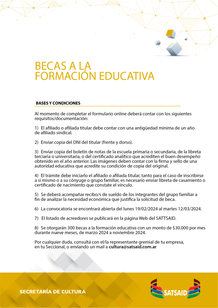 Las Becas a la Formación Educativa 2024 son el programa, impulsado y organizado por la Secretaría de Cultura del SATSAID, que otorga un acompañamiento económico mensual de $ 30.000-, desde marzo a noviembre, destinado a fortalecer el estudio y la formación educativa de los afiliados y las afiliadas y/o de sus hijos/as.