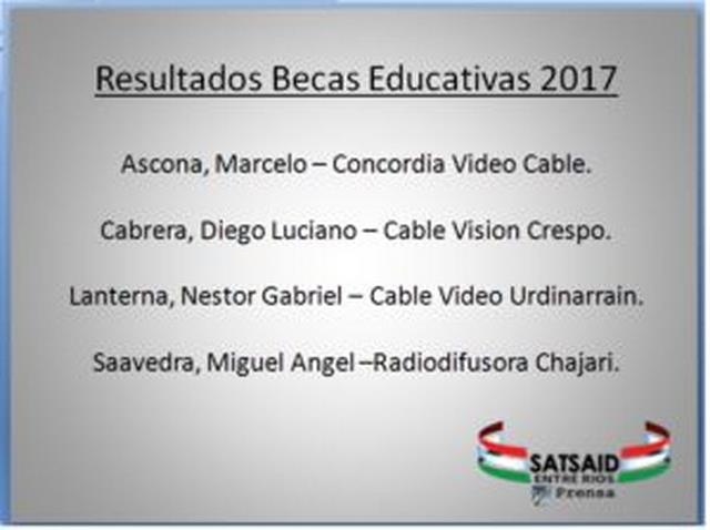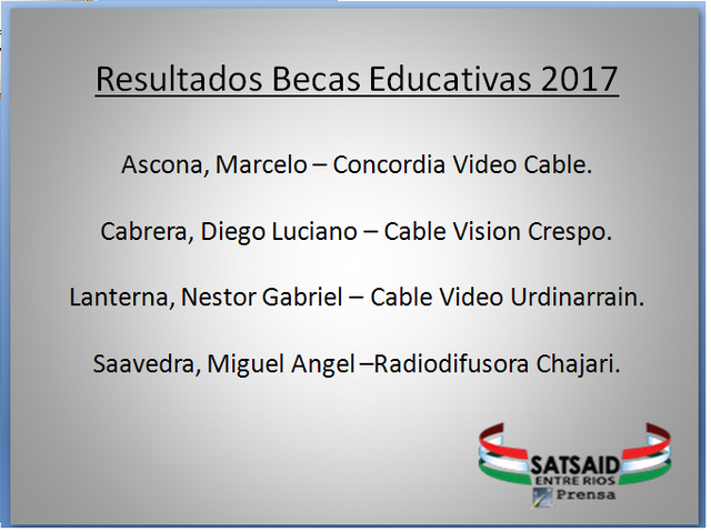 EL SATSAID ENTRE RÍOS felicita a los cuatro compañeros afiliados que resultaron favorecidos en las BECAS DE FORMACION EDUCATIVA . Asimismo, hacemos llegar un especial agradecimiento a todos los trabajadores que se presentaron para participar en este 2017.