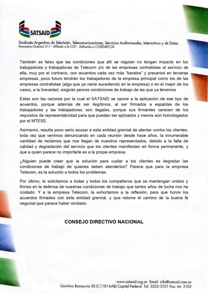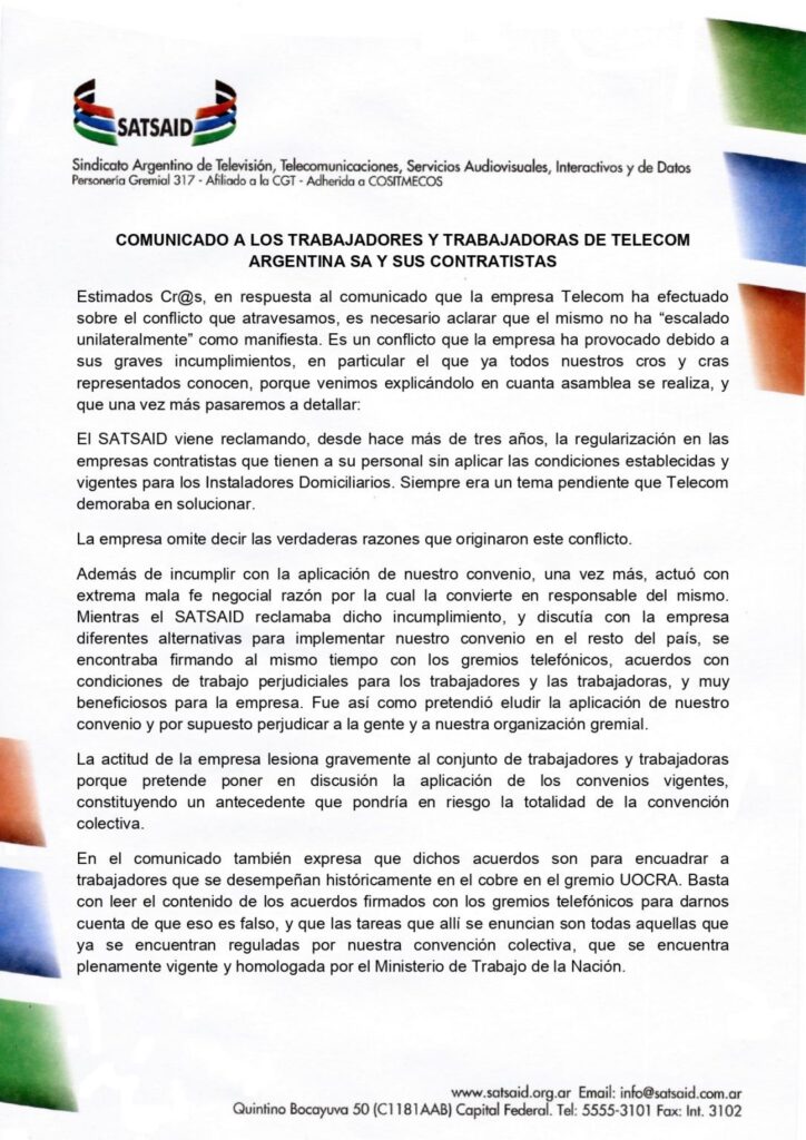El SATSAID emitió hoy un comunicado urgente a todos los trabajadores y las trabajadoras de Telecom Argentina S.A. y de todas las contratistas del país, luego de que trascendiera una comunicación interna de la empresa alegando una “escalada unilateral” del conflicto, en un texto en donde deliberadamente Telecom omite informar sobre las verdaderas razones de nuestro reclamo y que generaron el conflicto.
