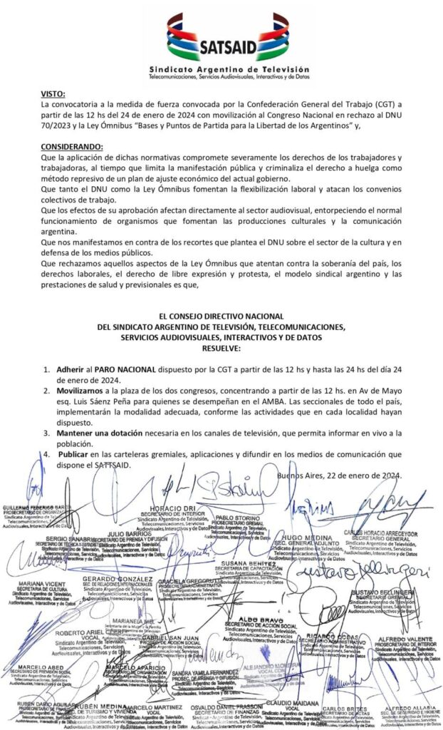 El Consejo Directivo Nacional del SATSAID reafirma su adhesión al paro con movilización dispuesto en el plan de lucha de la Confederación General del Trabajo (CGT) para el próximo miércoles 24 de enero y rechaza rotundamente el mega DNU y todos los aspectos regresivos de la ley ómnibus que intentan imponer el gobierno de La Libertad Avanza y Juntos por el Cambio.