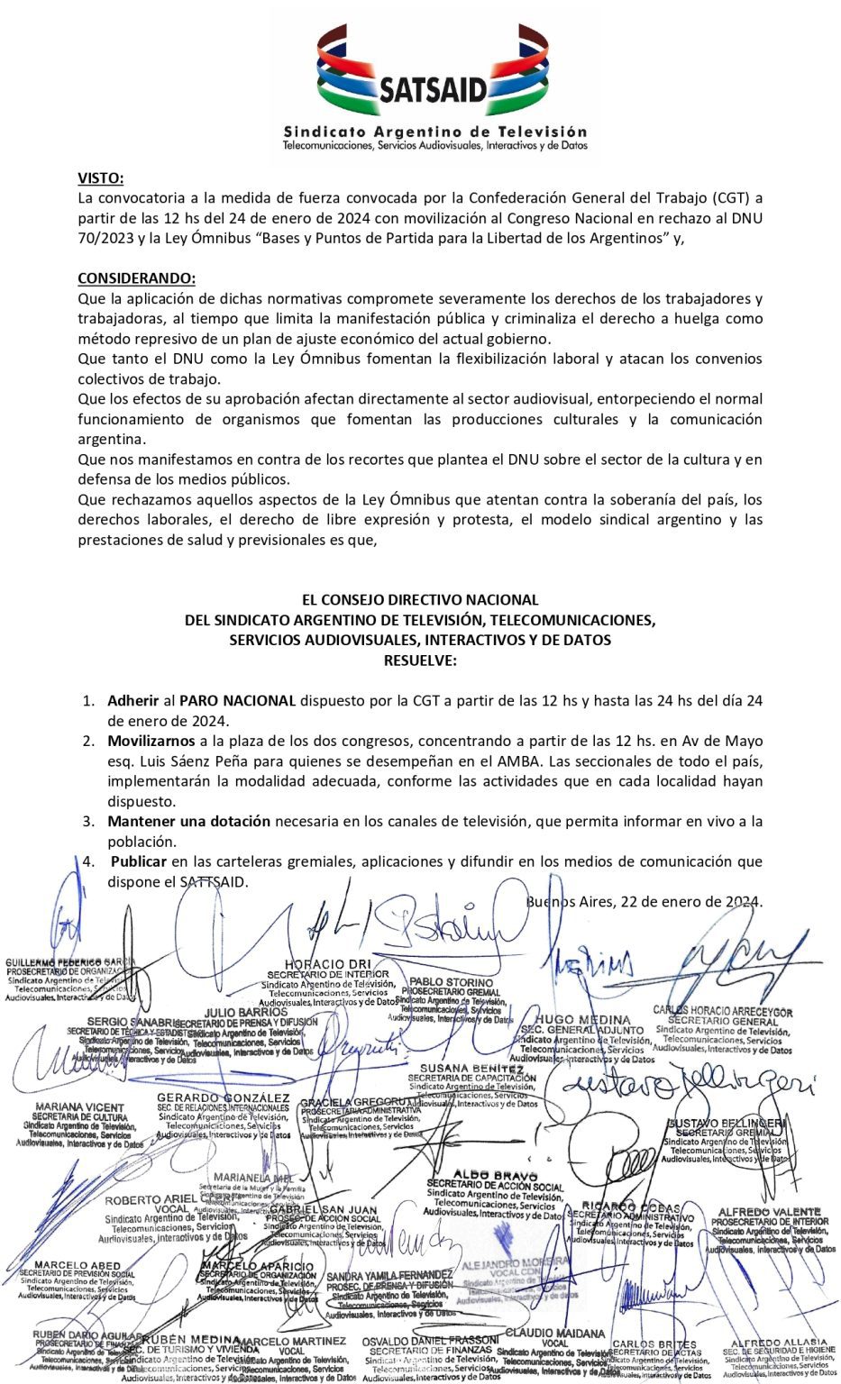 El Consejo Directivo Nacional del SATSAID reafirma su adhesión al paro con movilización dispuesto en el plan de lucha de la Confederación General del Trabajo (CGT) para el próximo miércoles 24 de enero y rechaza rotundamente el mega DNU y todos los aspectos regresivos de la ley ómnibus que intentan imponer el gobierno de La Libertad Avanza y Juntos por el Cambio.
