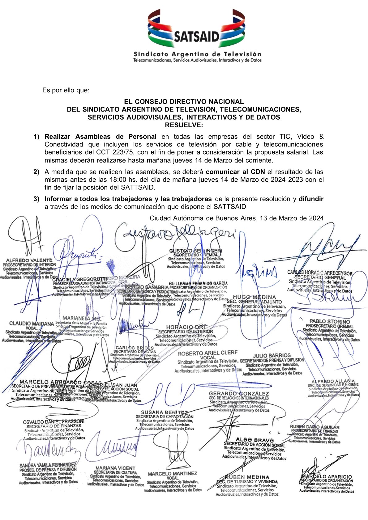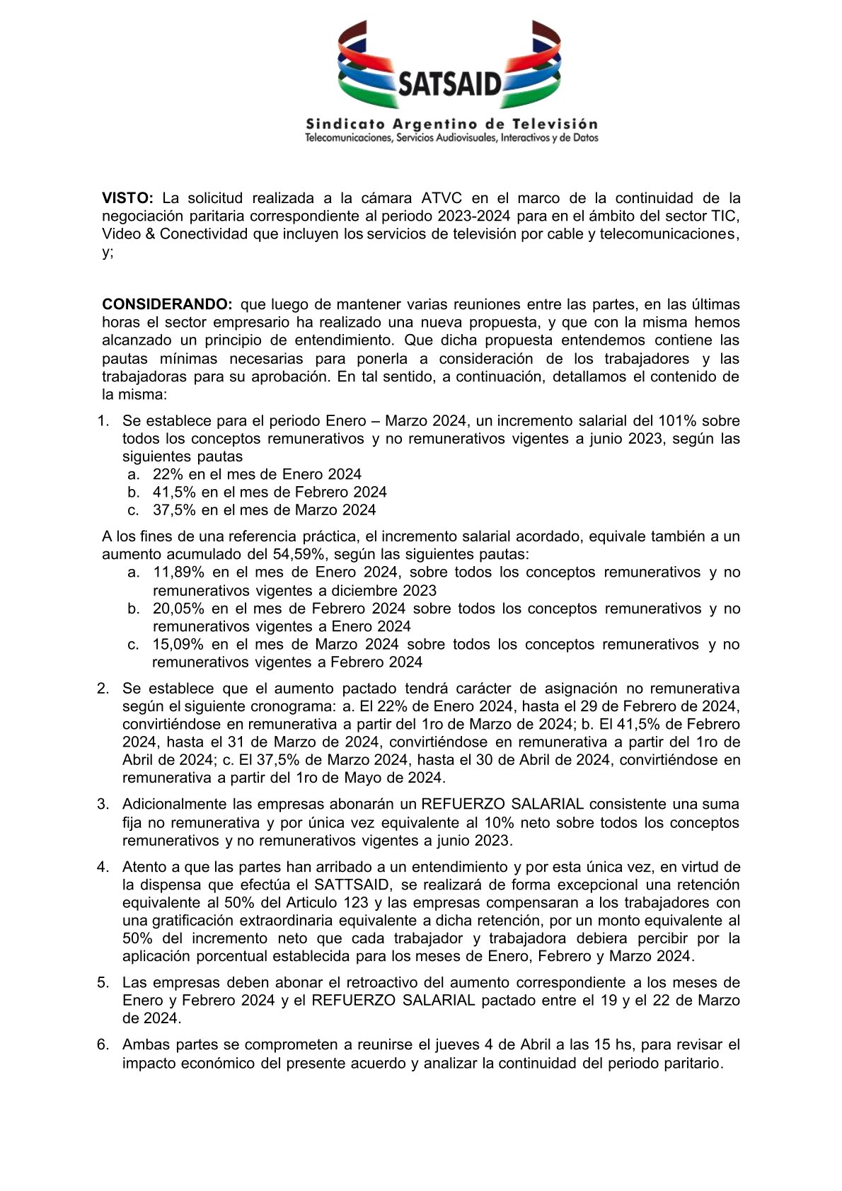 En el mismo sentido, el SATSAID y ATVC se comprometieron a reunirse nuevamente el jueves 4 de abril a las 15, para revisar el impacto inflacionario de la propuesta salarial y continuar las tratativas del período paritario.