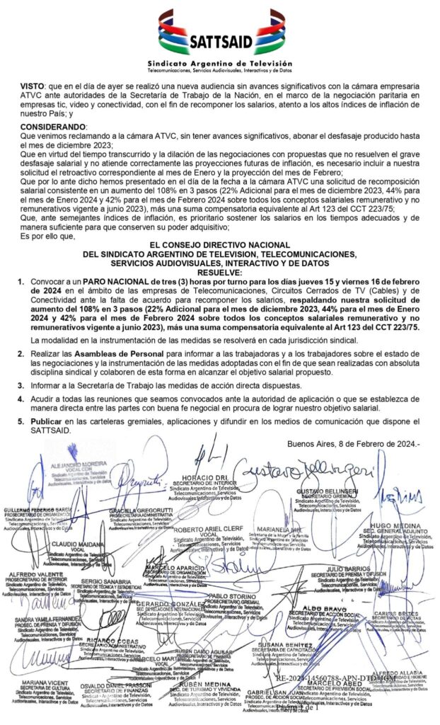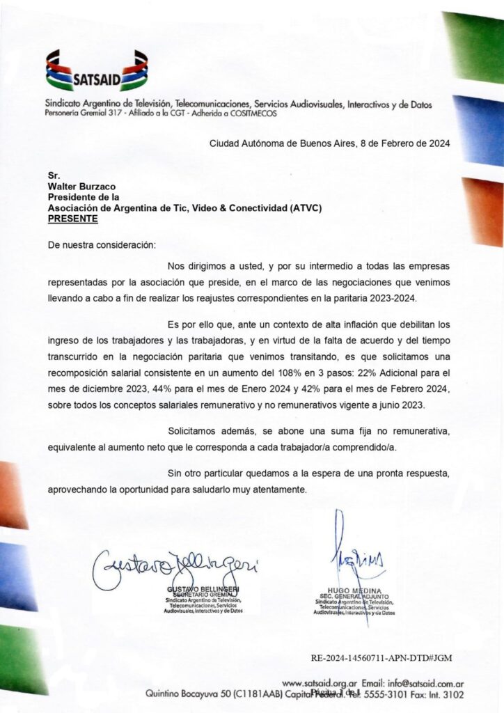 En el mismo sentido, el SATSAID dirigió una misiva al presidente de ATVC, Walter Burzaco, reafirmando su solicitud salarial, que consiste en un incremento del 108% a abonar en tres partes: 22% adicional para diciembre 2023, 44% para enero y 42% para febrero de 2024 más una suma equivalente al aumento neto que le corresponda a cada trabajador comprendido.