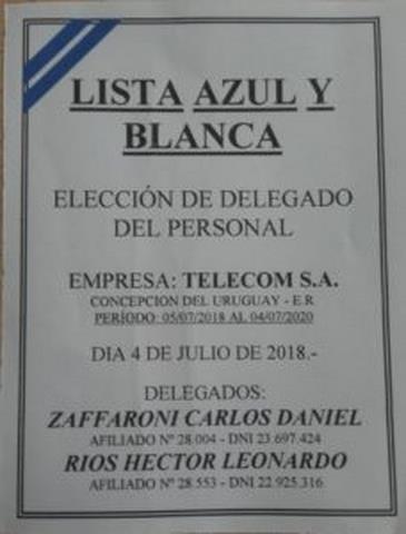 En el día de ayer, miércoles 4 de julio, se realizó la elección de delegados de personal en la empresa Telecom Argentina S.A. Concepción del Uruguay en donde resultaron electos para el período: 05/07/2018 al 04/07/2020, los compañeros Héctor Ríos y Carlos Zaffaroni en representación de la lista Azul y Blanca. Desde la Comisión Ejecutiva del SATSAID Seccional Entre Ríos, saludamos a los compañeros que han asumido el firme compromiso de defender los derechos de sus compañeros.