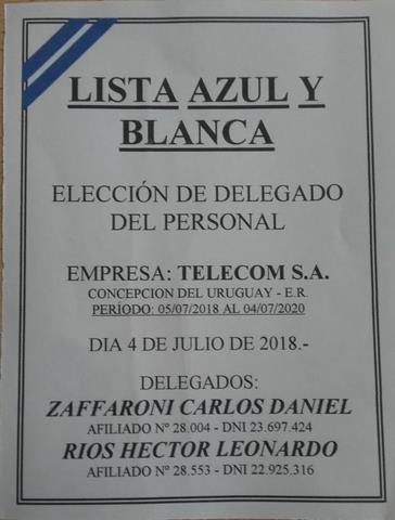 En el día de ayer, miércoles 4 de julio, se realizó la elección de delegados de personal en la empresa Telecom Argentina S.A. Concepción del Uruguay en donde resultaron electos para el período: 05/07/2018 al 04/07/2020, los compañeros Héctor Ríos y Carlos Zaffaroni en representación de la lista Azul y Blanca. Desde la Comisión Ejecutiva del SATSAID Seccional Entre Ríos, saludamos a los compañeros que han asumido el firme compromiso de defender los derechos de sus compañeros.
