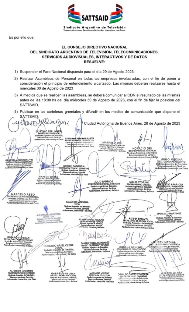 Representantes del SATSAID y de las empresas TIC, Video & Conectividad se reunieron hoy, en el marco de la revisión salarial correspondiente al Convenio Colectivo de Trabajo 223/75, y alcanzaron un principio de entendimiento para los meses de agosto y septiembre, que cerrarían el trimestre julio-septiembre 2023. Luego de varias instancias de una dura negociación, las empresas realizaron una propuesta salarial del 18% sobre todos los conceptos vigentes a junio 2023, a abonar en dos etapas: 10% en agosto, que sumado al 6,5% acordado en julio acumularía un 16,5% total para dicho mes 8% en septiembre, acumulando un incremento del 24,5% para dicho mes Ambas partes se comprometieron, además, a reunirse nuevamente el viernes 15 de septiembre, a las 16hs, para revisar el impacto económico del presente acuerdo y analizar la continuidad del período paritario. Por tal motivo, el SATSAID suspende las medidas de fuerza anunciadas para el martes 29 de agosto y convoca a asambleas de trabajadores y trabajadoras del sector, hasta el próximo miércoles 30 de agosto a las 18hs, para poner a consideración el principio de entendimiento alcanzado.