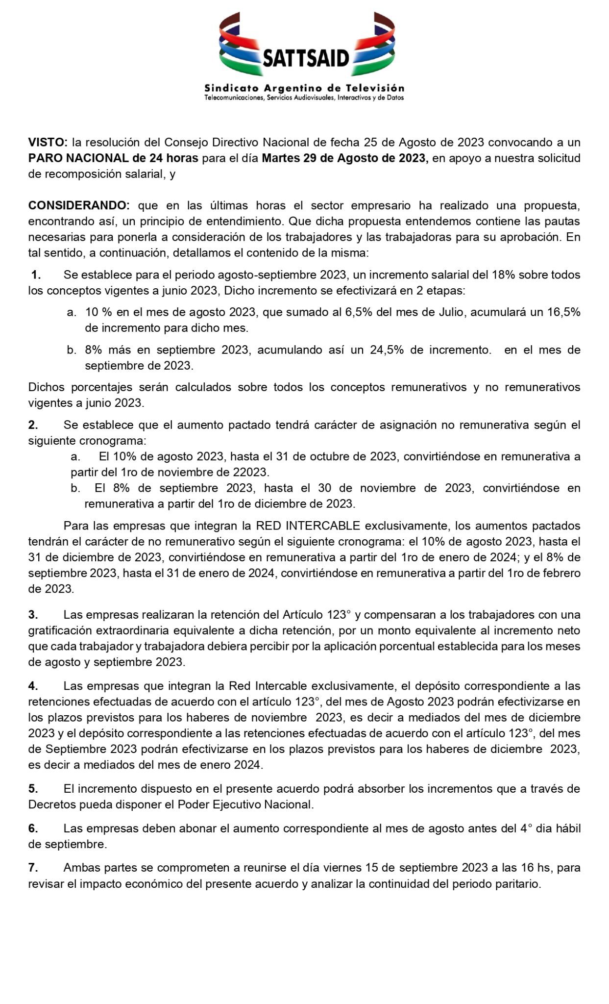 Representantes del SATSAID y de las empresas TIC, Video & Conectividad se reunieron hoy, en el marco de la revisión salarial correspondiente al Convenio Colectivo de Trabajo 223/75, y alcanzaron un principio de entendimiento para los meses de agosto y septiembre, que cerrarían el trimestre julio-septiembre 2023. Luego de varias instancias de una dura negociación, las empresas realizaron una propuesta salarial del 18% sobre todos los conceptos vigentes a junio 2023, a abonar en dos etapas: 10% en agosto, que sumado al 6,5% acordado en julio acumularía un 16,5% total para dicho mes 8% en septiembre, acumulando un incremento del 24,5% para dicho mes Ambas partes se comprometieron, además, a reunirse nuevamente el viernes 15 de septiembre, a las 16hs, para revisar el impacto económico del presente acuerdo y analizar la continuidad del período paritario. Por tal motivo, el SATSAID suspende las medidas de fuerza anunciadas para el martes 29 de agosto y convoca a asambleas de trabajadores y trabajadoras del sector, hasta el próximo miércoles 30 de agosto a las 18hs, para poner a consideración el principio de entendimiento alcanzado.