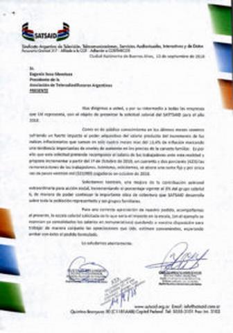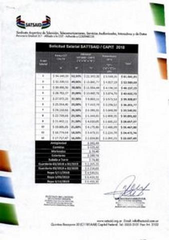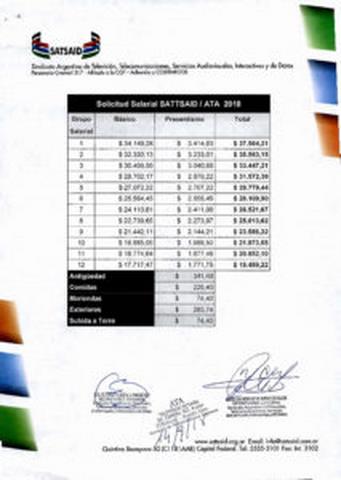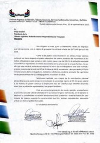 Informamos a las compañeras/os de todo el país que realizan sus tareas en canales abiertos o productoras que el Consejo Directivo Nacional del SATSAID ha presentado ante las cámaras ATA y CAPIT un pedido de aumento salarial del 42% y una suma fija por única vez de $21000.