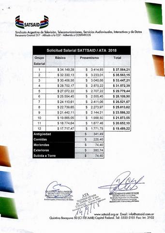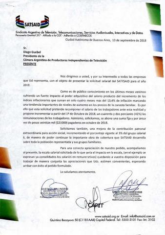 Informamos a las compañeras/os de todo el país que realizan sus tareas en canales abiertos o productoras que el Consejo Directivo Nacional del SATSAID ha presentado ante las cámaras ATA y CAPIT un pedido de aumento salarial del 42% y una suma fija por única vez de $21000.