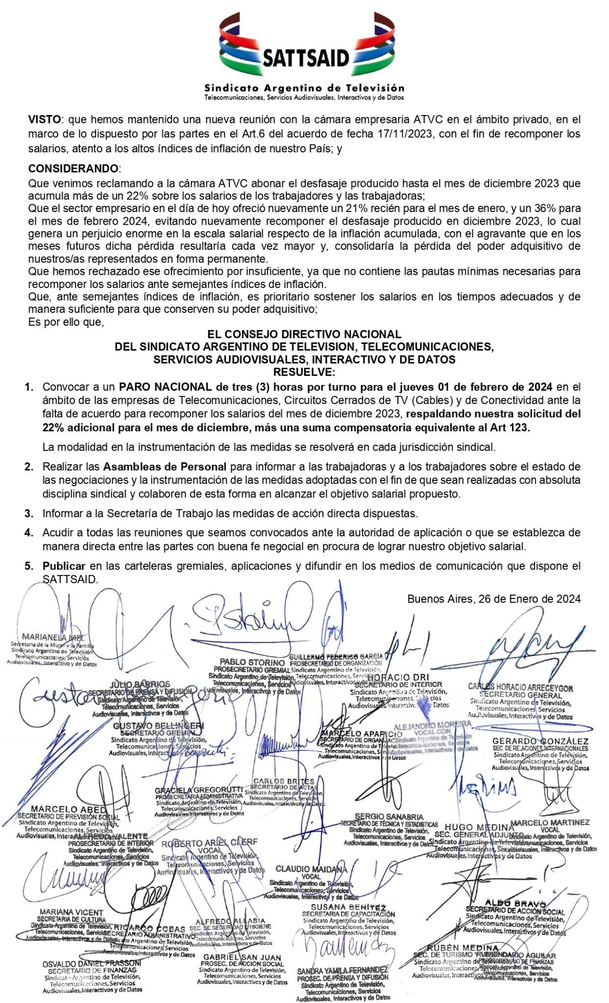 El SATSAID convoca a un paro nacional de tres horas por turno, el próximo jueves 1 de febrero, en todas las empresas TIC, video y conectividad. Tras una nueva reunión entre representantes del SATSAID y de la Asociación Argentina Tic, Video & Conectividad (ATVC), las empresas volvieron a presentar una propuesta que nuestro gremio rechazó por insuficiente. En esta ocasión, las empresas ofrecieron, sobre la base de junio 2023, un incremento del 21% para enero y del 36% para febrero, omitiendo presentar una propuesta de recomposición para el mes de diciembre, tal como se había establecido en el último acuerdo. Aceptar esta oferta, implicaría asumir un desfasaje de más de veintidós puntos sólo en diciembre, incrementándose mes a mes esa diferencia, aún con los porcentajes propuestos por las empresas para enero y febrero. Si se tienen en cuenta los índices de inflación proyectada para los primeros meses del año por el Relevamiento de Expectativas de Mercado (REM), la pérdida del salario real de los trabajadores y trabajadoras del sector sería extremadamente sensible e irrecuperable a medida que pasa el tiempo. Es por esta razón que nuestro gremio rechazó la propuesta, al considerarla insuficiente. Luego de realizarse un plenario del cual participaron los secretarios y secretarias Generales de todas las seccionales del país, delegados y delegadas del AMBA, el Consejo Directivo Nacional resolvió convocar a un paro nacional. En el delicado contexto económico que estamos atravesando y ante la urgencia de recomposición salarial que transita el sector, exigimos a las empresas celeridad a la hora de dar respuesta al justo reclamo de las y los trabajadores de la actividad. Tras un extenso intercambio, sin haber alcanzado avances definitorios en la negociación y sin perjuicio de las medidas dispuestas, ambas partes fijaron una nueva reunión el próximo miércoles 31 de enero a las 14.